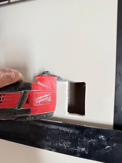 - Cut openings behind the TV and near the outlet on drywall.