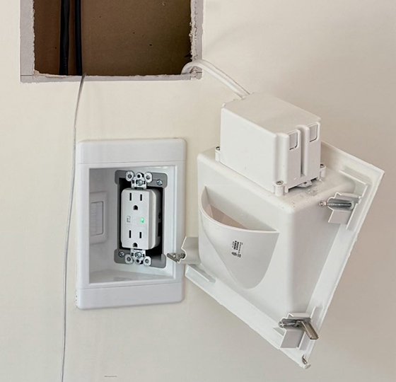 - Install a new outlet behind the TV connected to the lower outlet, all concealed inside the drywall.