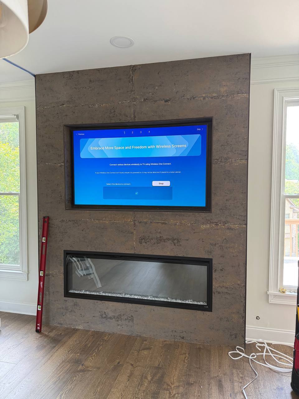 ✅ Clean Cable Management Frame TVs come with a One Connect Box, so only one nearly invisible cable runs from the TV to the box. We route the cable inside the wall whenever possible (standard on drywall). On solid surfaces like brick or tile, we offer discreet surface-mount channels that can be painted to blend with your wall. If you're mounting above a fireplace, we can often run the cable through the wall cavity or behind nearby drywall.