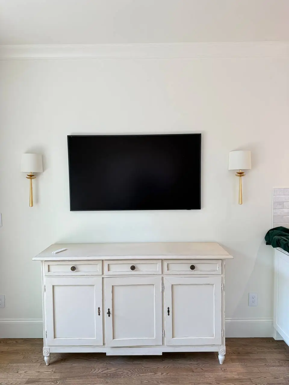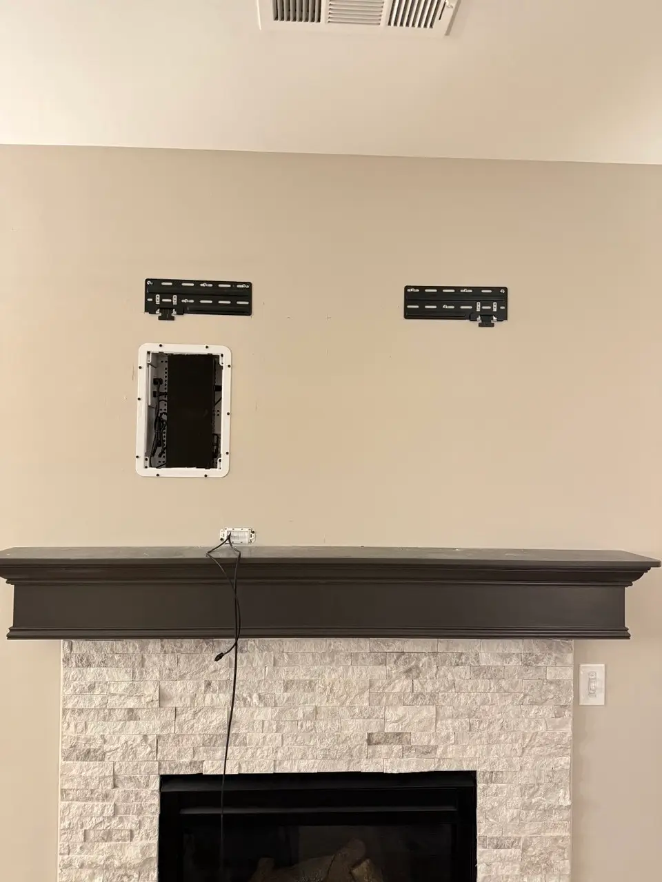 *For hidden wires we cut two openings — one behind the TV and another near the power outlet — to neatly hide the power cable inside the wall. To complete the look, we install sleek white cover plates for a clean and seamless finish.